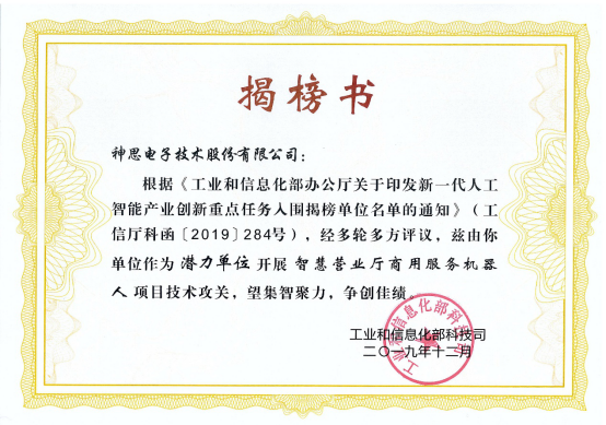近日,工業(yè)和信息化部辦公廳印發(fā)“新一代人工智能產(chǎn)業(yè)創(chuàng)新重點(diǎn)任務(wù)入圍揭榜單位名單”,山東省共8家企業(yè)入圍重點(diǎn)任務(wù)榜單,神思電子獲批潛力單位,開展智慧營業(yè)廳商用服務(wù)機(jī)器人項(xiàng)目技術(shù)攻關(guān)。