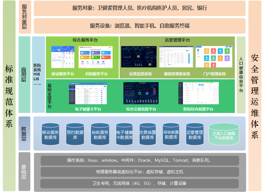 基礎(chǔ)支撐平臺(tái):電子健康卡管理系統(tǒng)、電子健康卡注冊(cè)管理系統(tǒng)、跨域主索引系統(tǒng)、用卡監(jiān)測(cè)系統(tǒng)、醫(yī)療服務(wù)統(tǒng)一接入平臺(tái)、聚合支付集成系統(tǒng)、結(jié)算賬務(wù)管理系統(tǒng)、支付綜合監(jiān)測(cè)系統(tǒng)