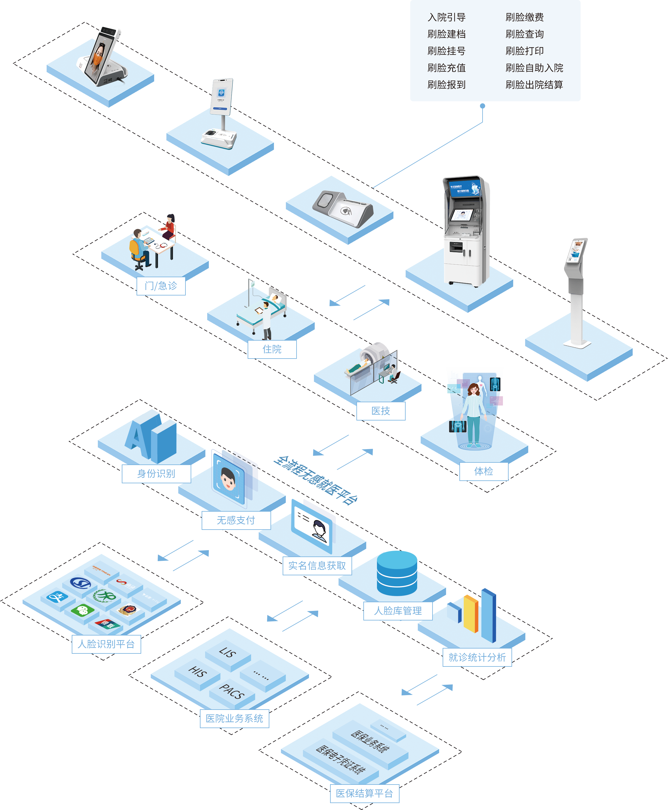 智慧門診:人臉/證卡/行業(yè)電子碼建檔、當(dāng)日/預(yù)約掛號(hào)、預(yù)約取號(hào)、預(yù)約簽到、交費(fèi)結(jié)算、報(bào)告單/發(fā)票打印、信息查詢、3D導(dǎo)航、智能導(dǎo)診
